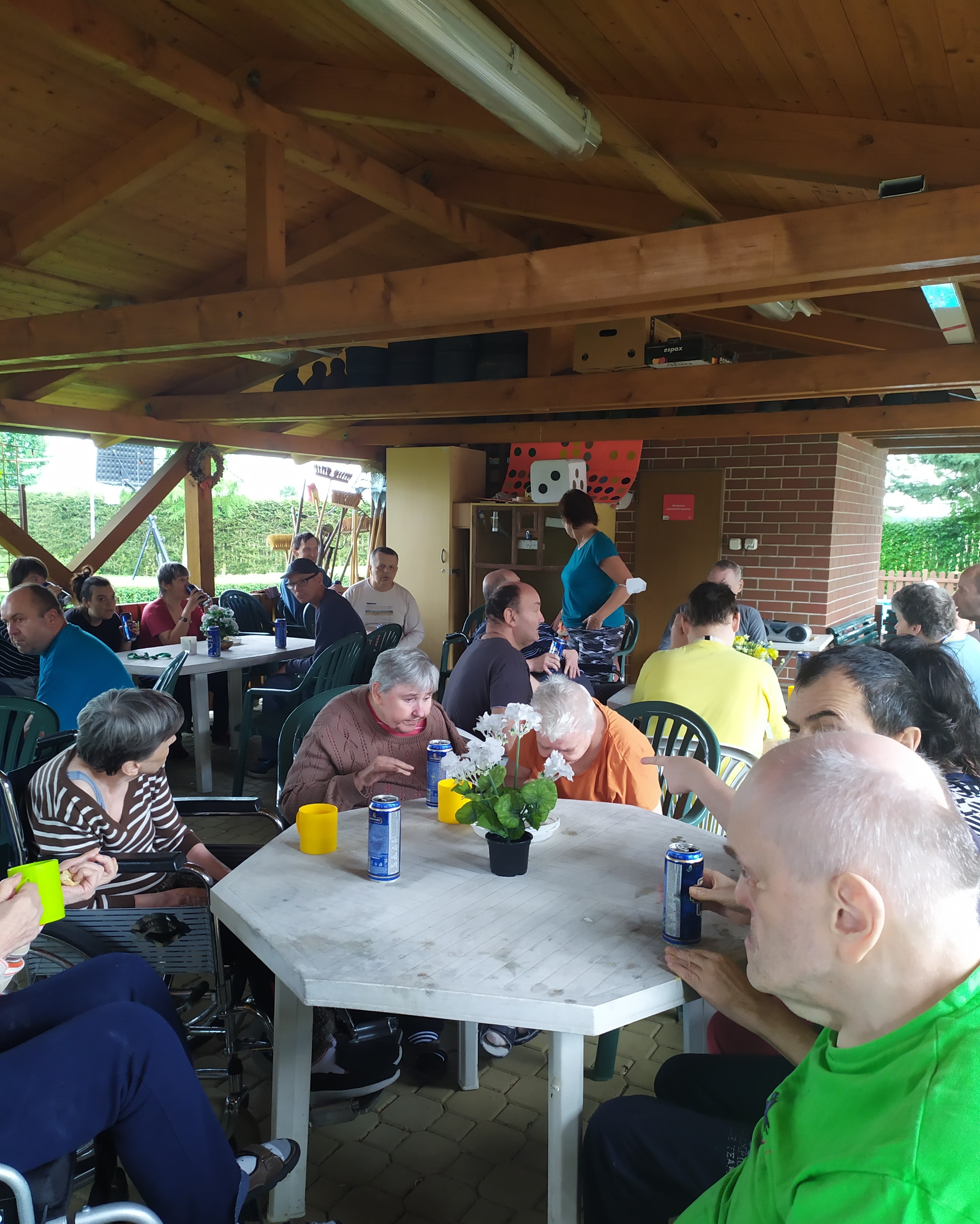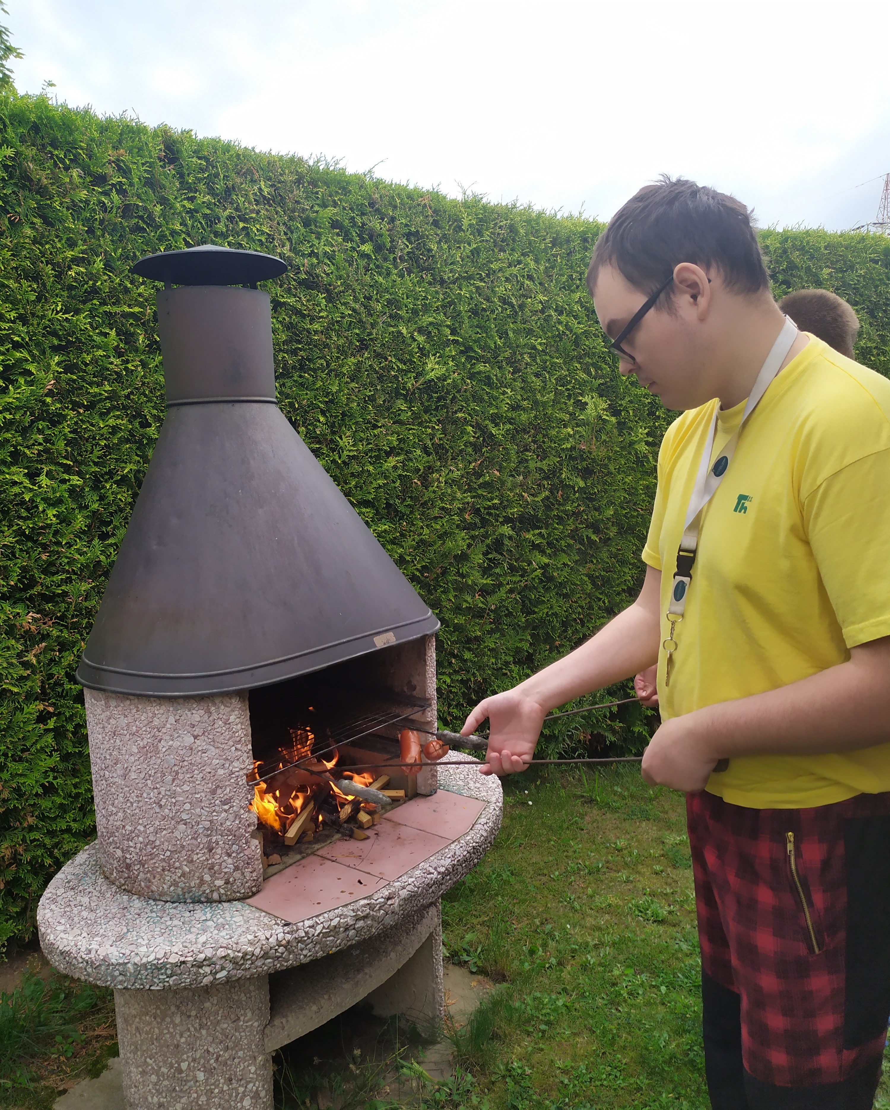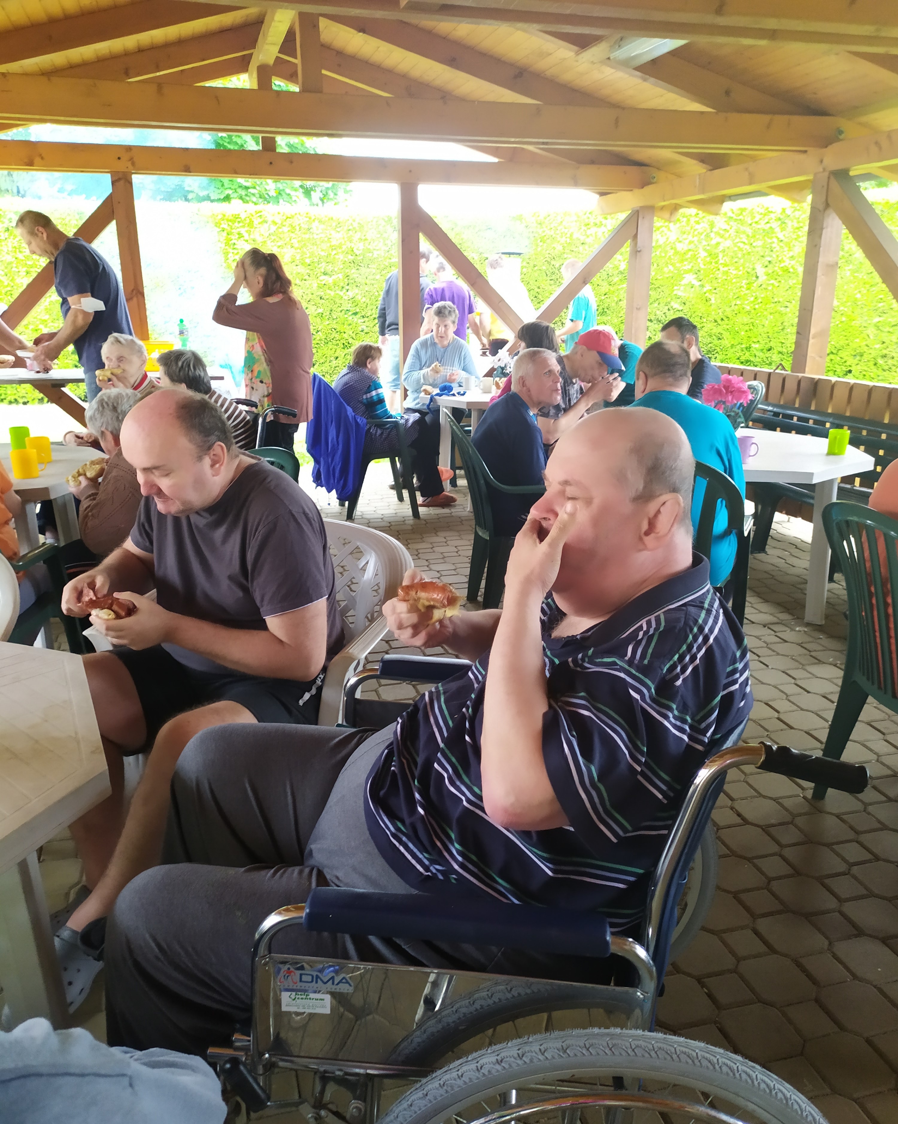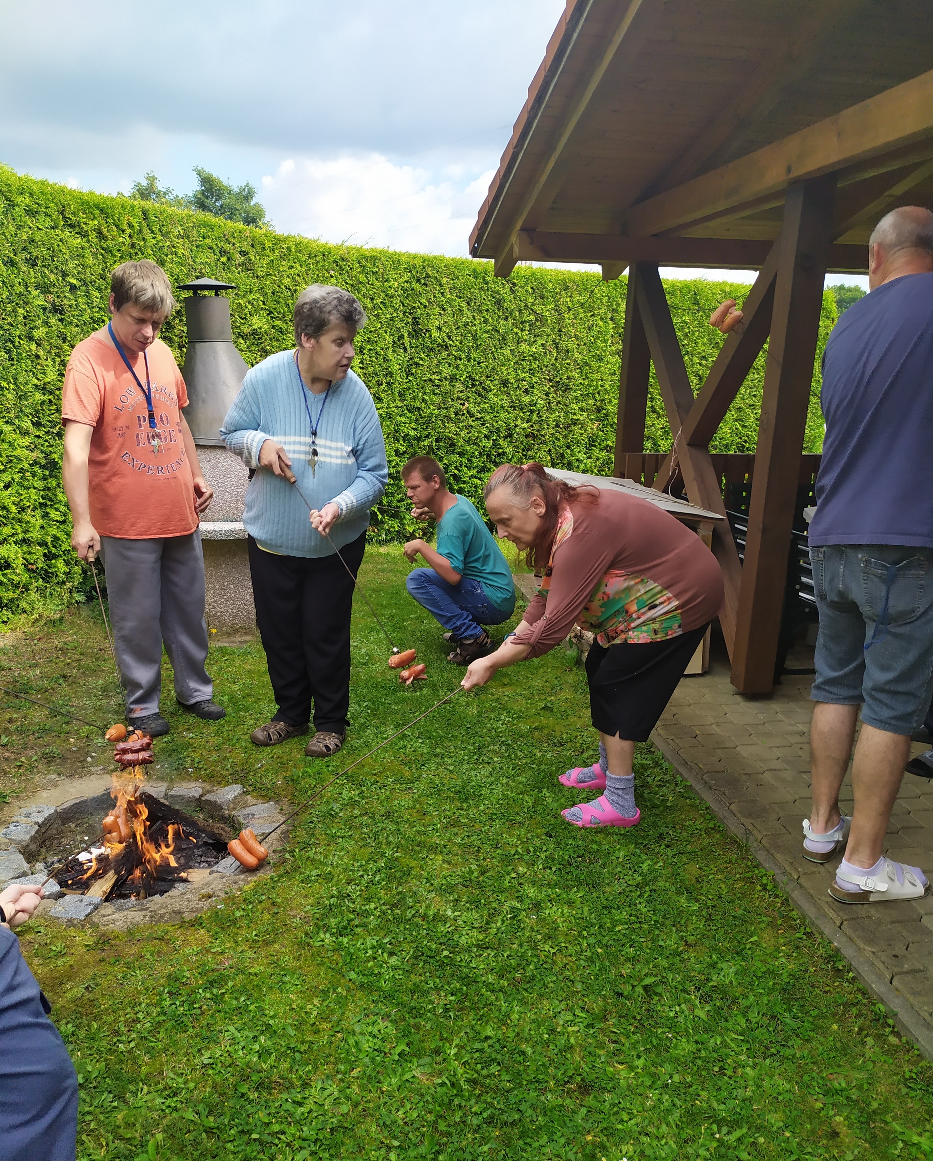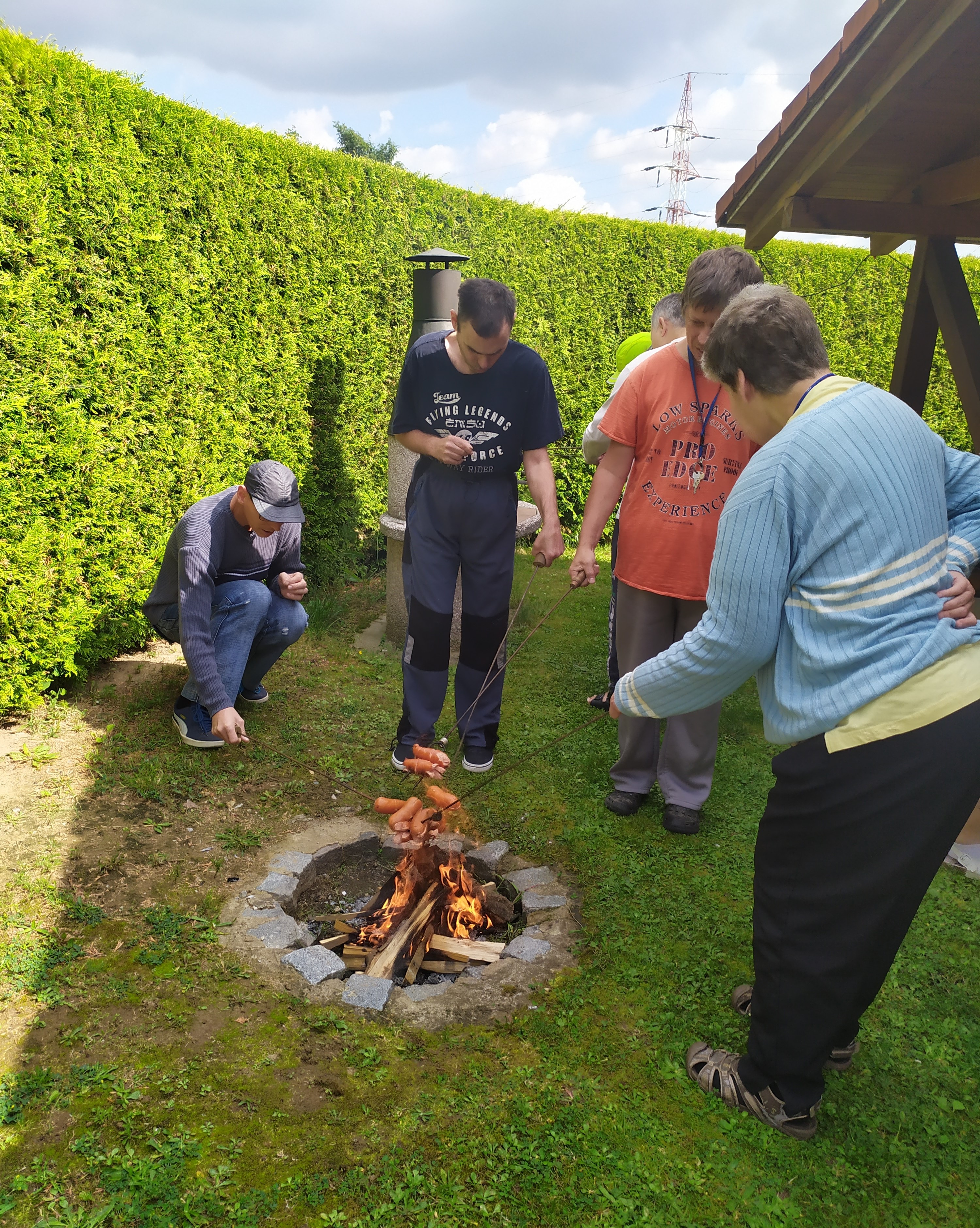 Krásné počasí vylákalo některé uživatele domova pro osoby se zdravotním postižením k posezení na pergole a opékaní buřtů.