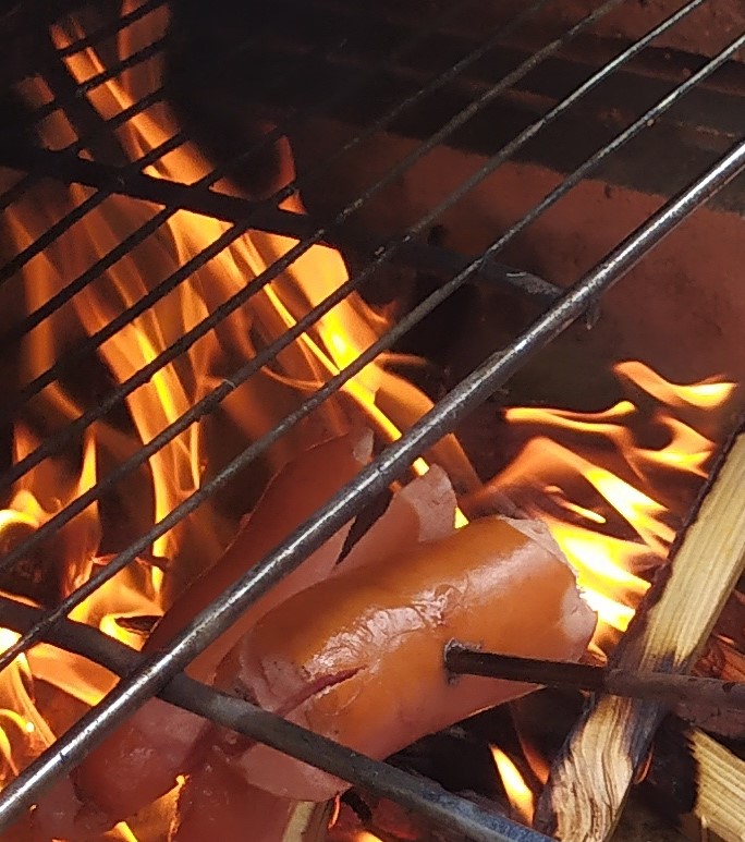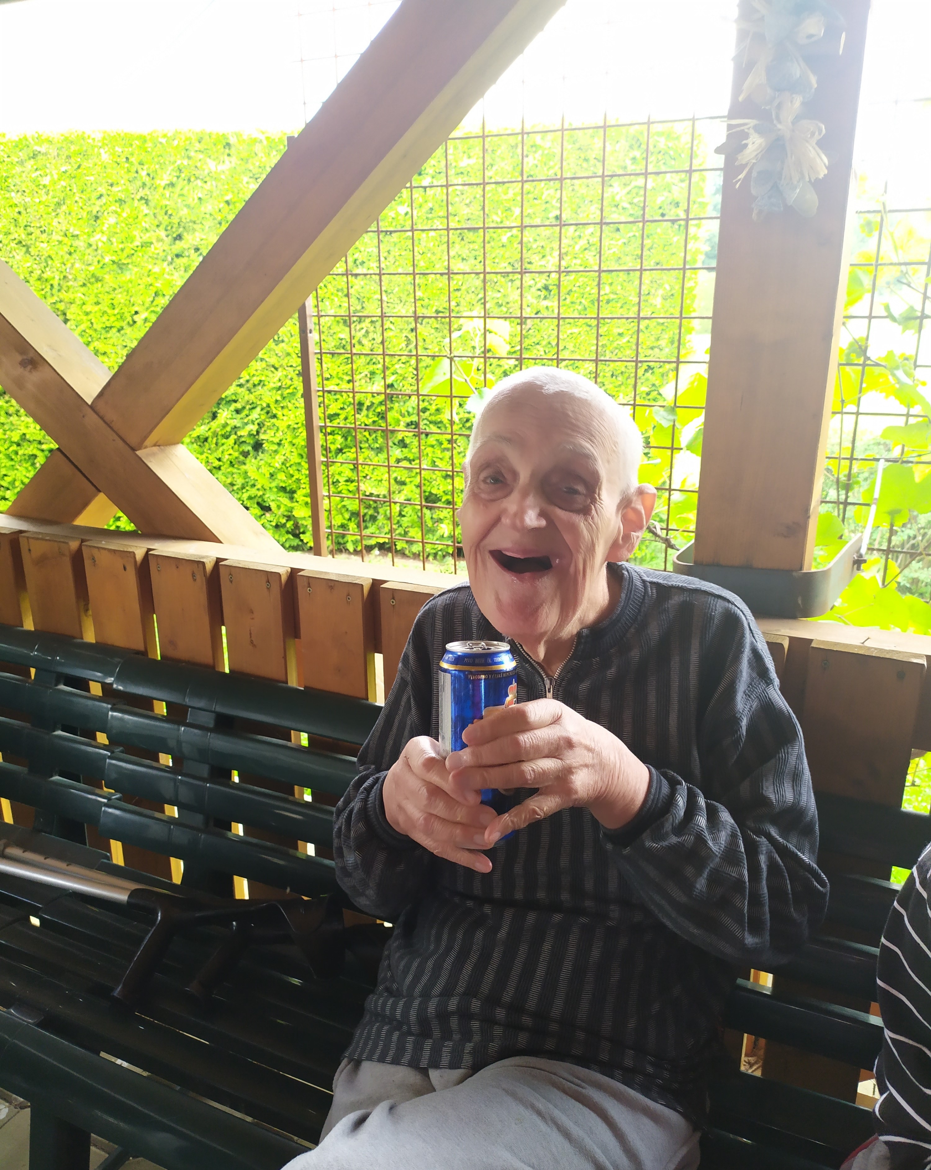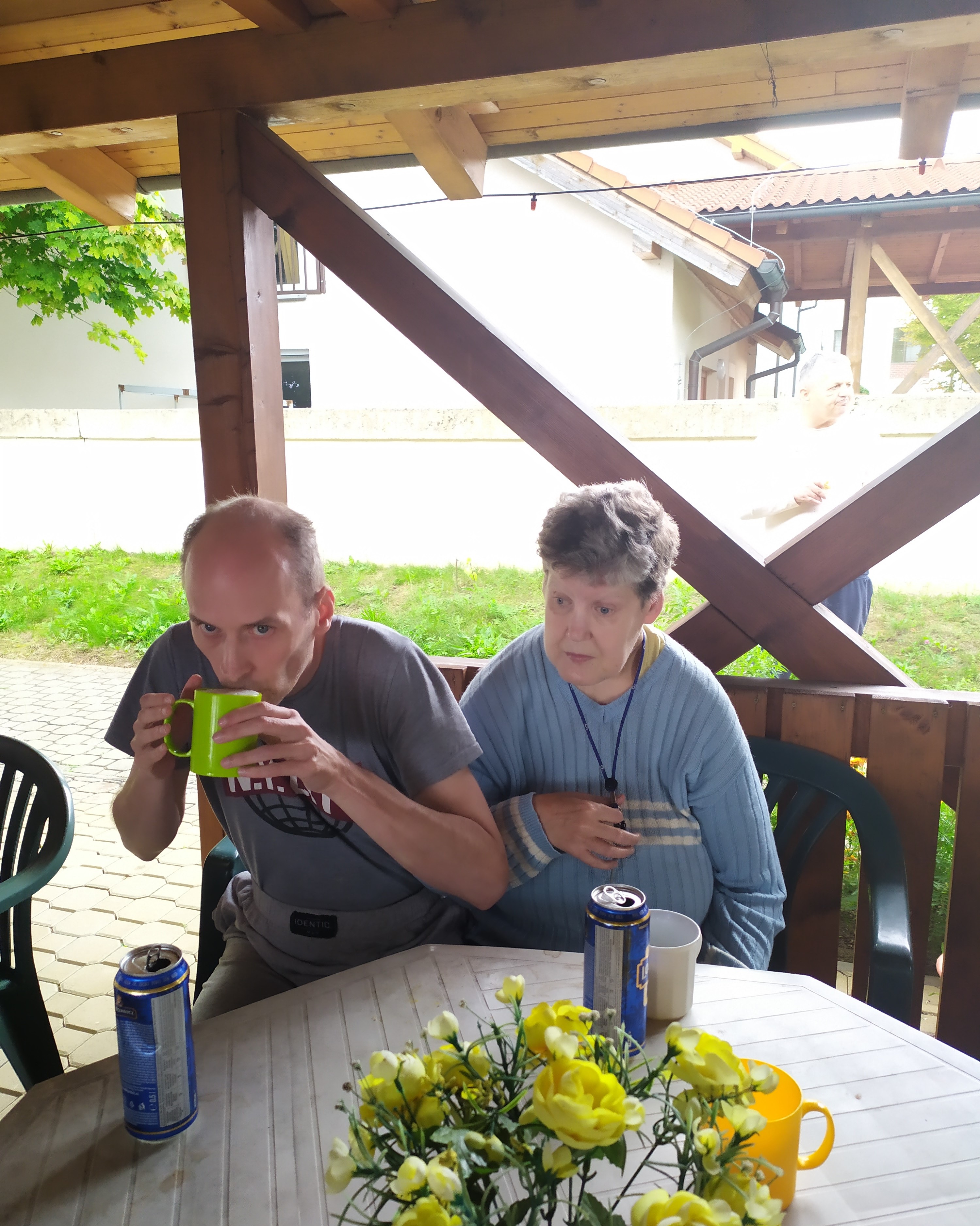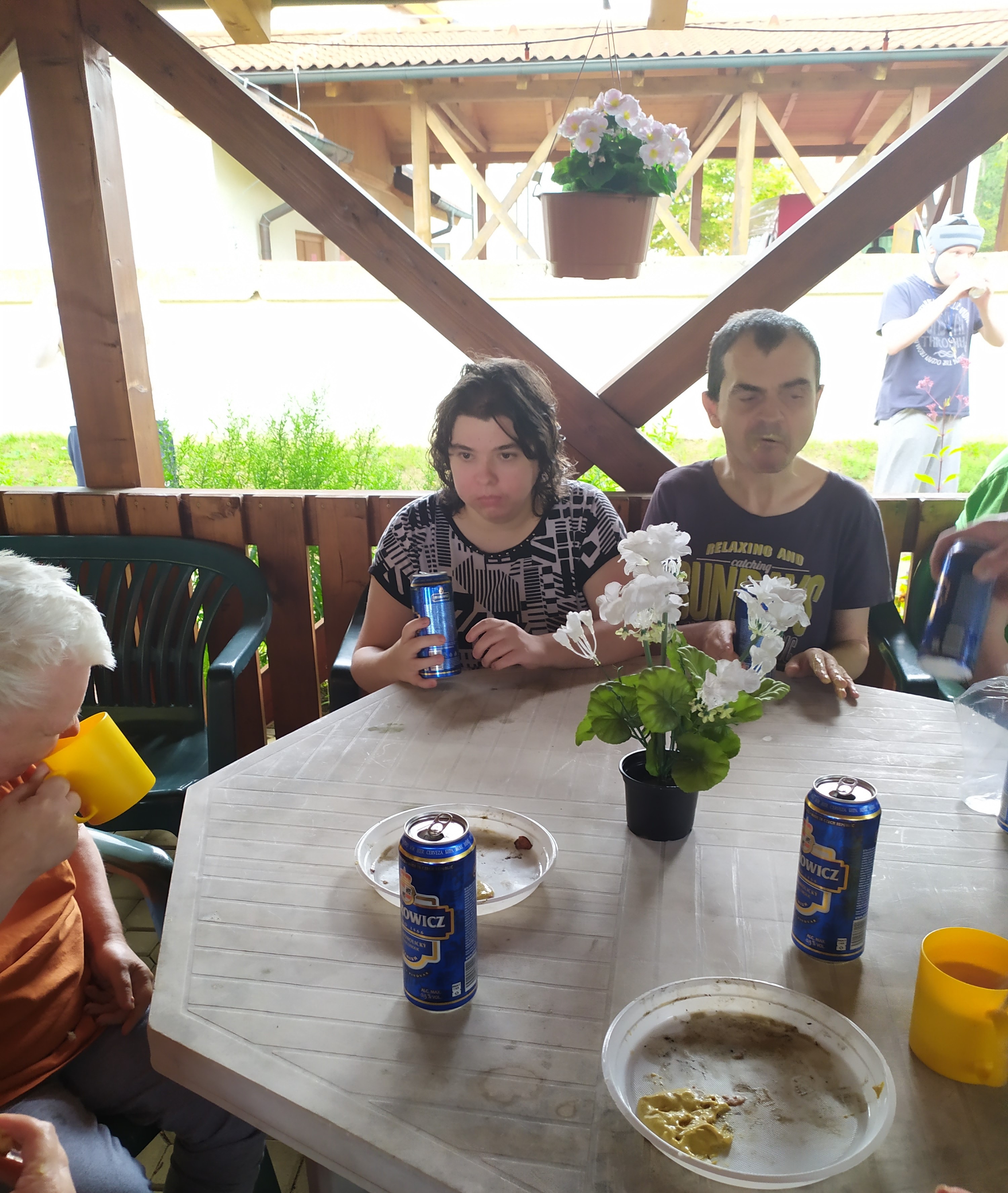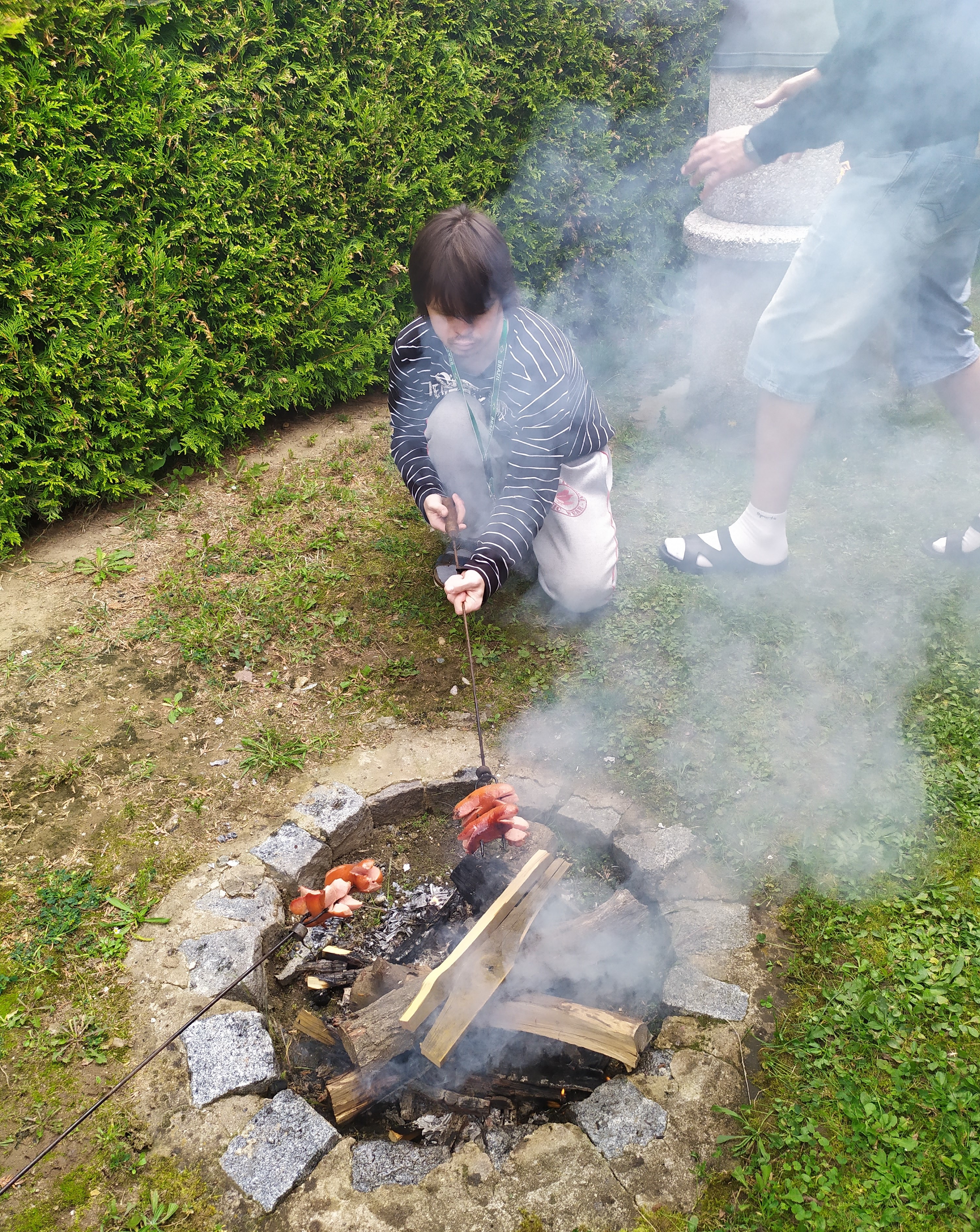 Krásné počasí vylákalo některé uživatele domova pro osoby se zdravotním postižením k posezení na pergole a opékaní buřtů.